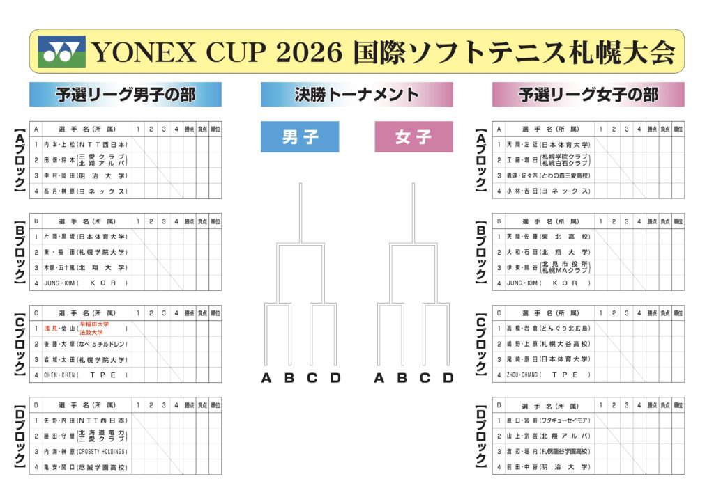 2026年1月25日(日)北海道立総合体育センター「北海きたえーる」にて開催される標記大会の組み合わせについて、選手変更がありましたので修正した組み合わせを掲載いたします。