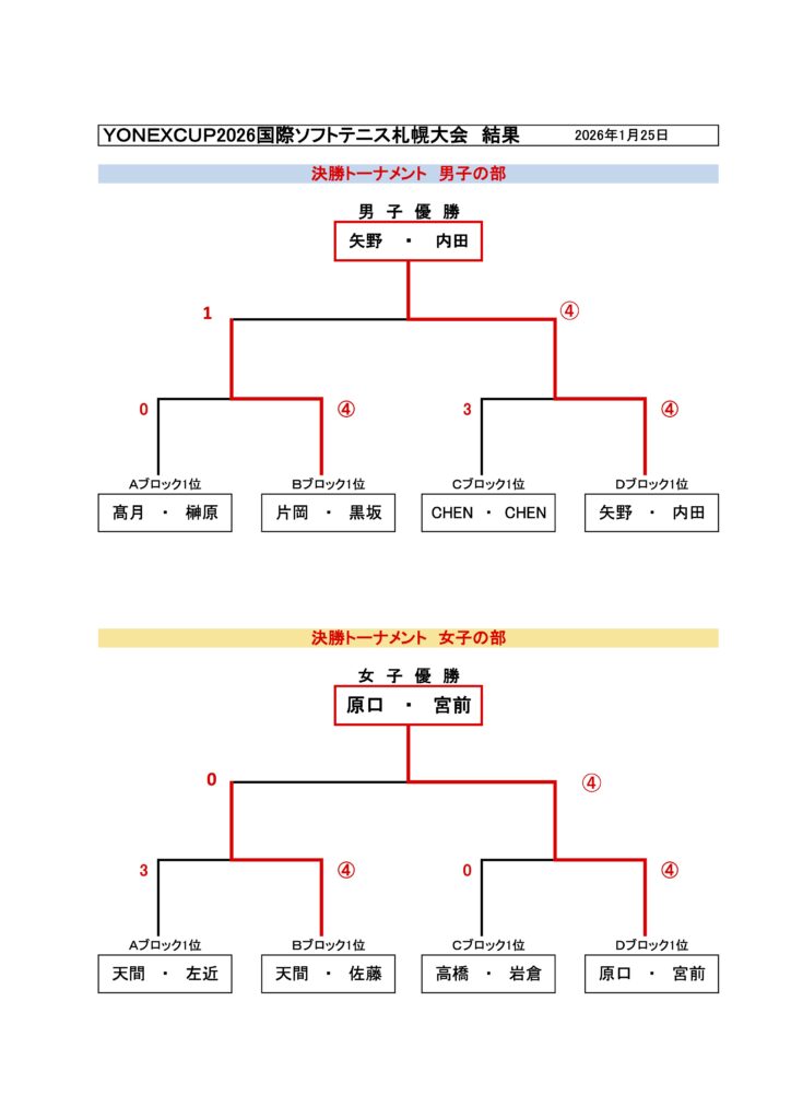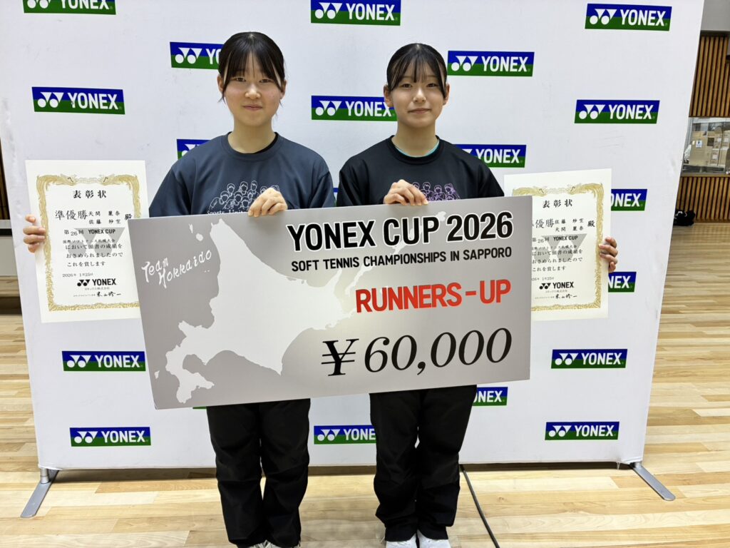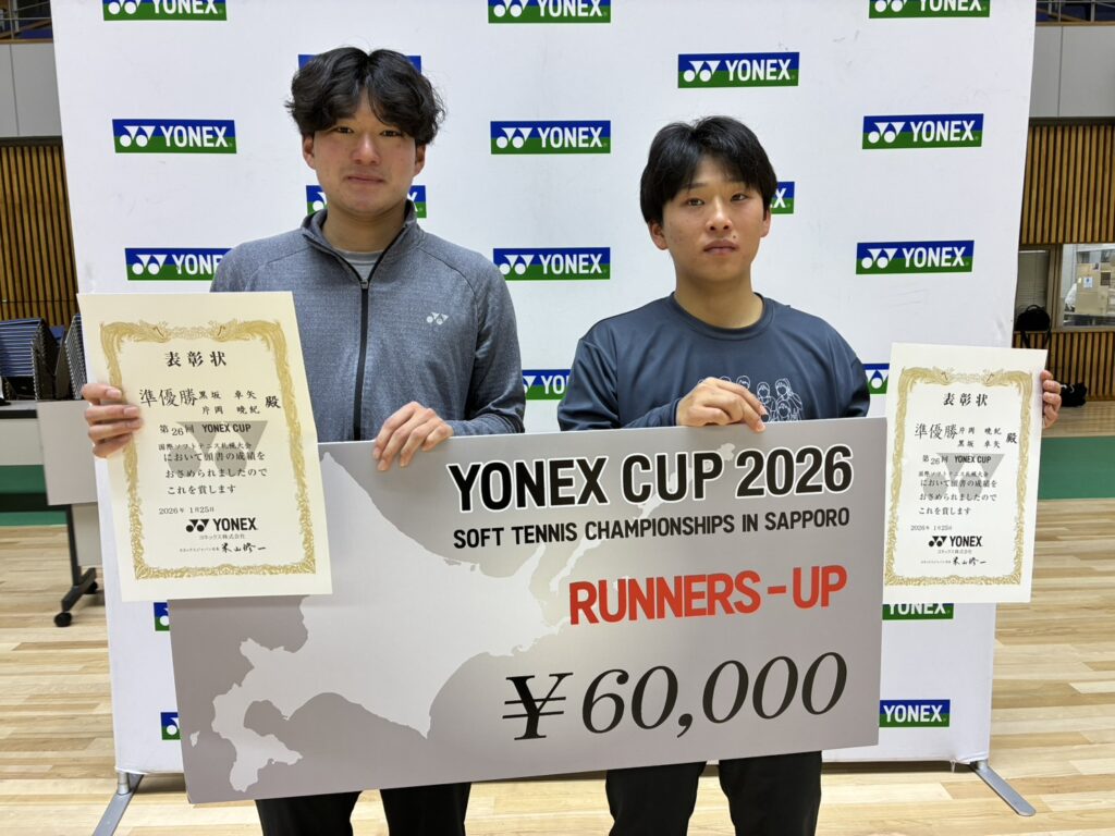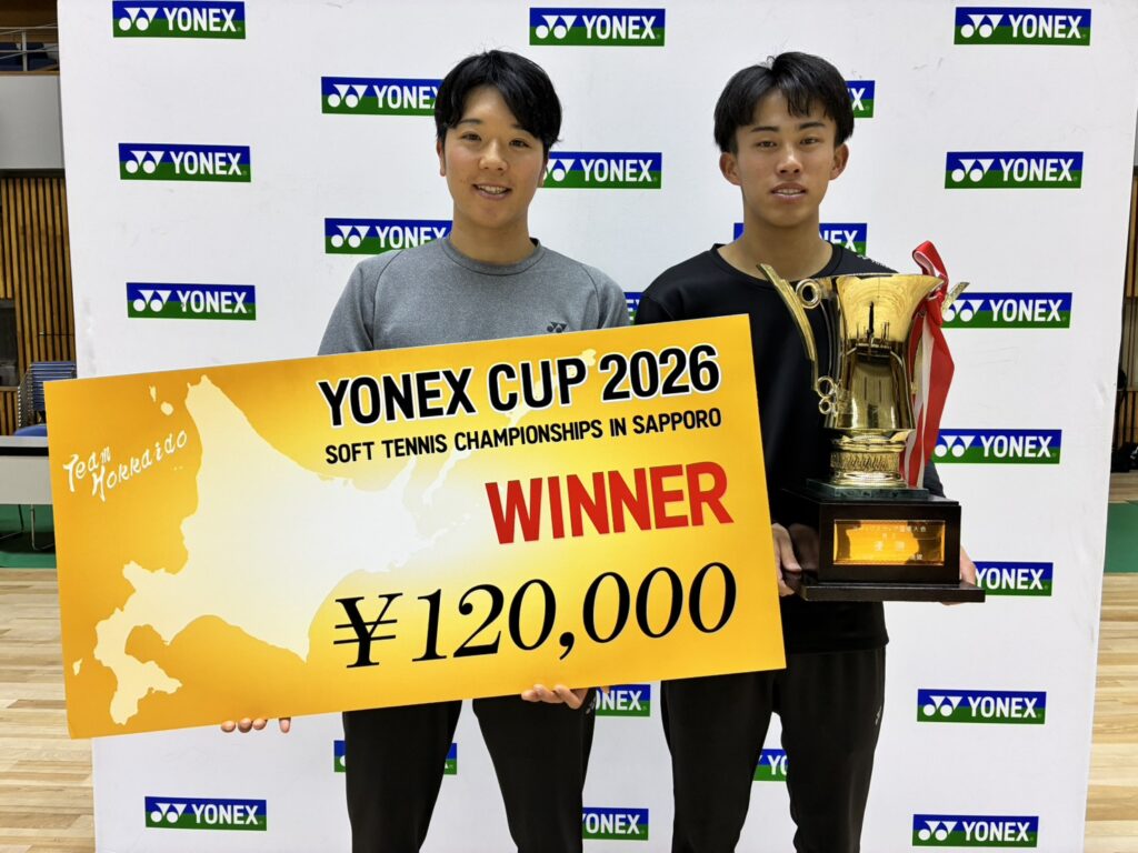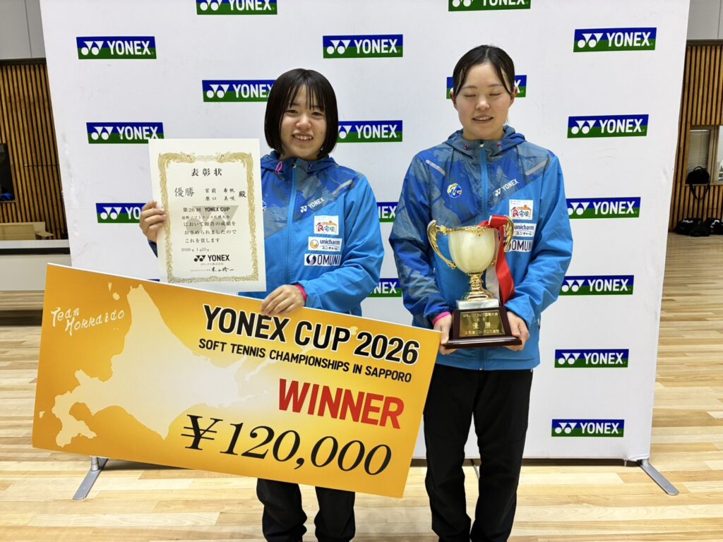 YONEXCUP2026国際ソフトテニス札幌大会の最終結果について 2026/1/25 2026/1/27 事務局, 国際インドア, 大会結果, 専門委員会, 広報委員会 本日、YONEXCUP2026国際ソフトテニス札幌大会が本日開催され、先ほど全日程が終了しました。トップ選手のスーパープレイに多くの観客から拍手が送られていました!結果はこちら 入賞者の写真を掲載します ↑男子優勝 矢野・内田ペア(NTT西日本) ↑男子準優勝 片岡・黒坂ペア(日本体育大学) ↑女子優勝 原口・宮前ペア(ワタキューセイモア) ↑女子準優勝 天間・佐藤ペア(東北高校)