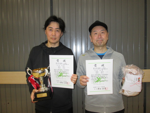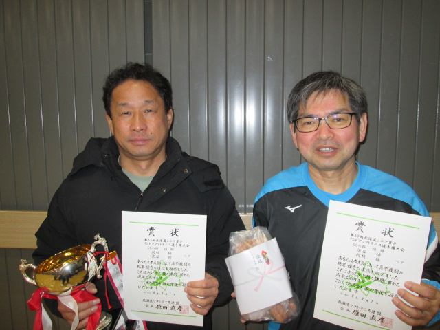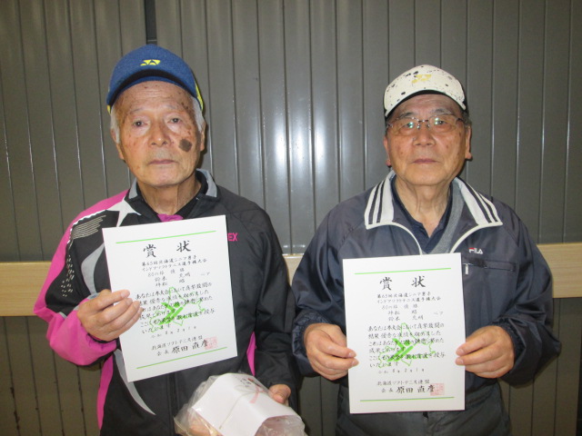 第65回北海道シニア男子インドアソフトテニス選手権大会の結果について 2026/2/4 事務局, 大会結果, 専門委員会, 広報委員会 標記の大会が2026年2月1日(日)に江別市(NOPPOROヤシマ商店スポーツパーク)で開催されました。結果はこちら表彰者の写真を掲載します。 ↑45男子優勝 成田・丹羽ペア(札幌三省ク・北見連盟) ↑50男子優勝 河村・染谷ペア(札幌白石ク) ↑60男子優勝 遠藤・寿崎ペア(札幌青陽ク) ↑65男子優勝 吉本・高橋ペア(北見連盟・旭川暁ク) ↑70男子優勝 郷・大島ペア(函館ベテランク) ↑75男子優勝 渡辺・御厩ペア(札幌やこぜん・札幌もみじ台ク) ↑80男子優勝 鈴木・坪松ペア(札幌やこぜん)